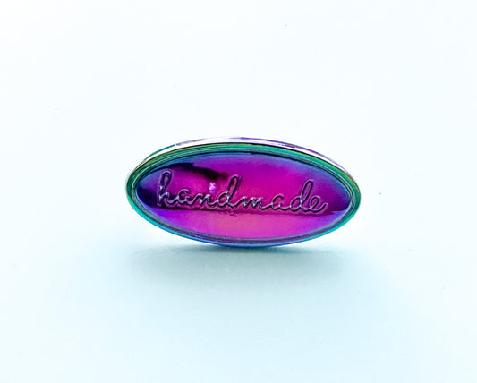 “Handmade” metal oval bag label