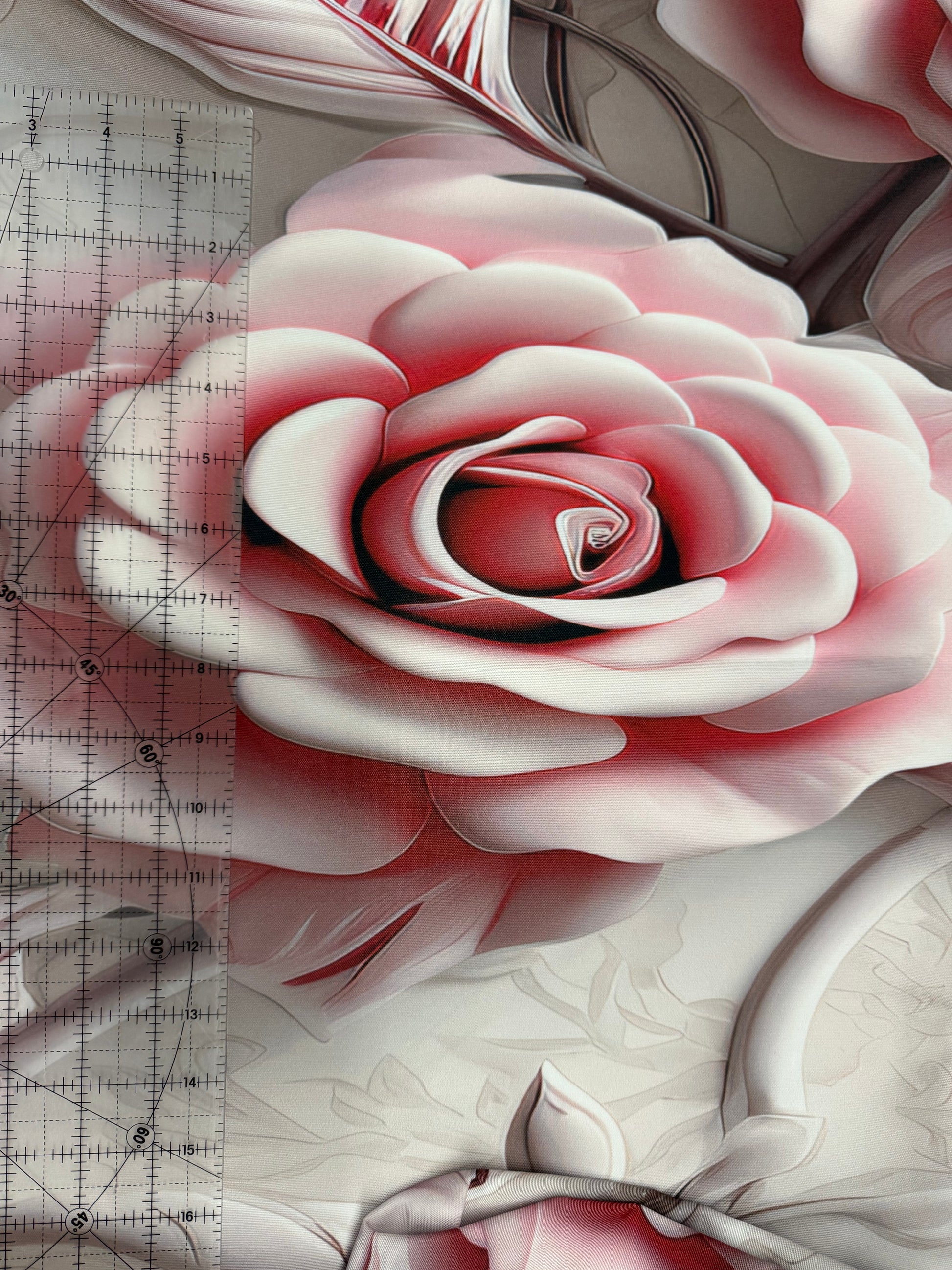This fabric had the design printed at a super wrong scale. The large roses are bigger than my head (see photo with ruler). It looks great otherwise just a little hard to use on the exterior of small projects. Would be great to test projects with, still line bags if you aren’t concerned about the scale, etc.
