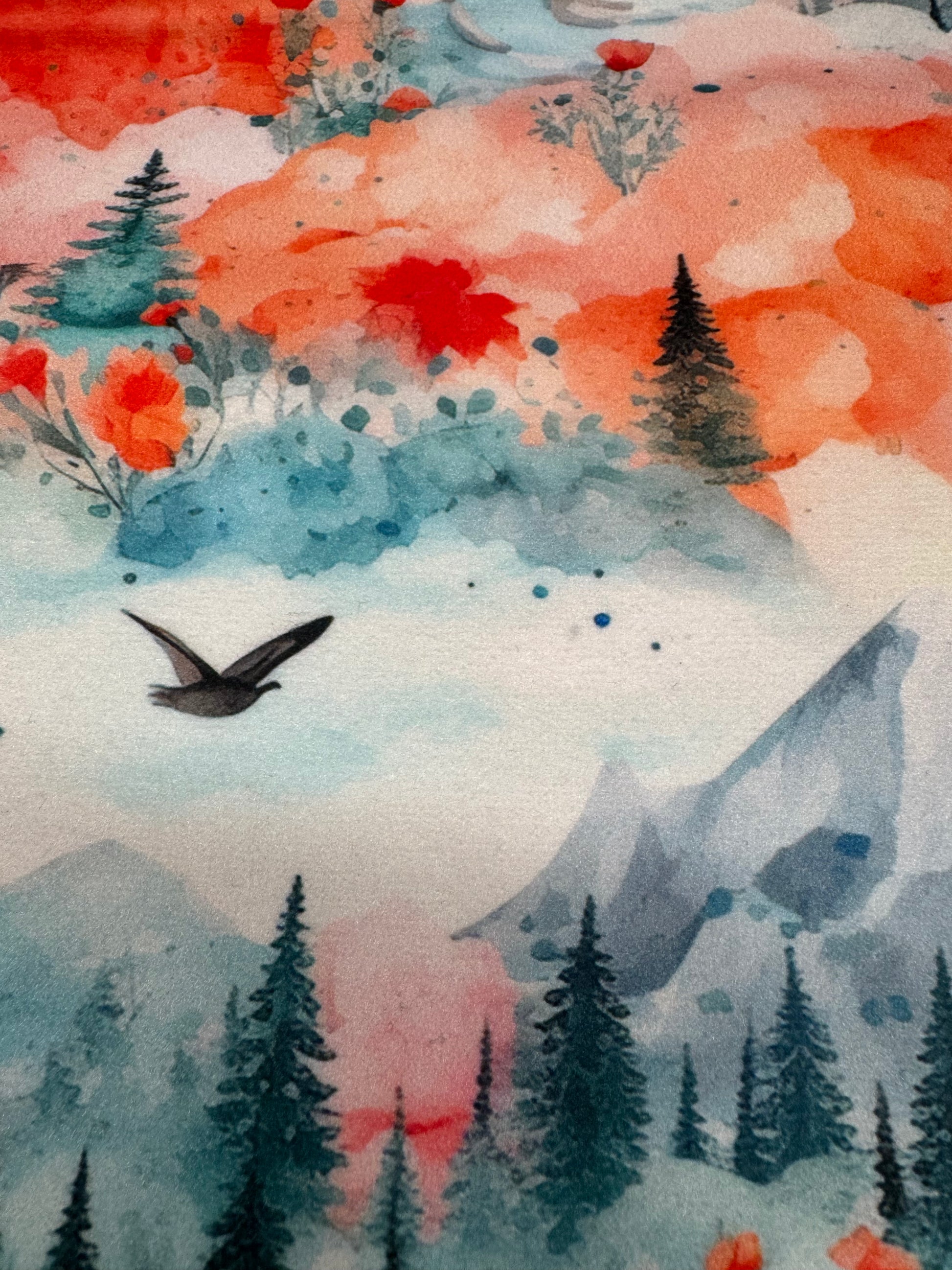 This softshell had the design printed on the fleece backing instead of the smooth exterior. While the design looks amazing I cannot guarantee how well the print will hold up in the elements if used as coat fabric. Might work great to line bags with.