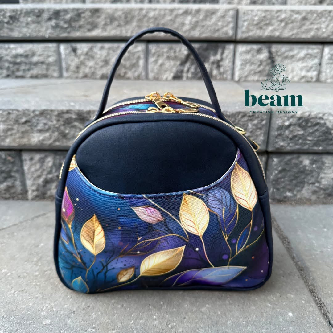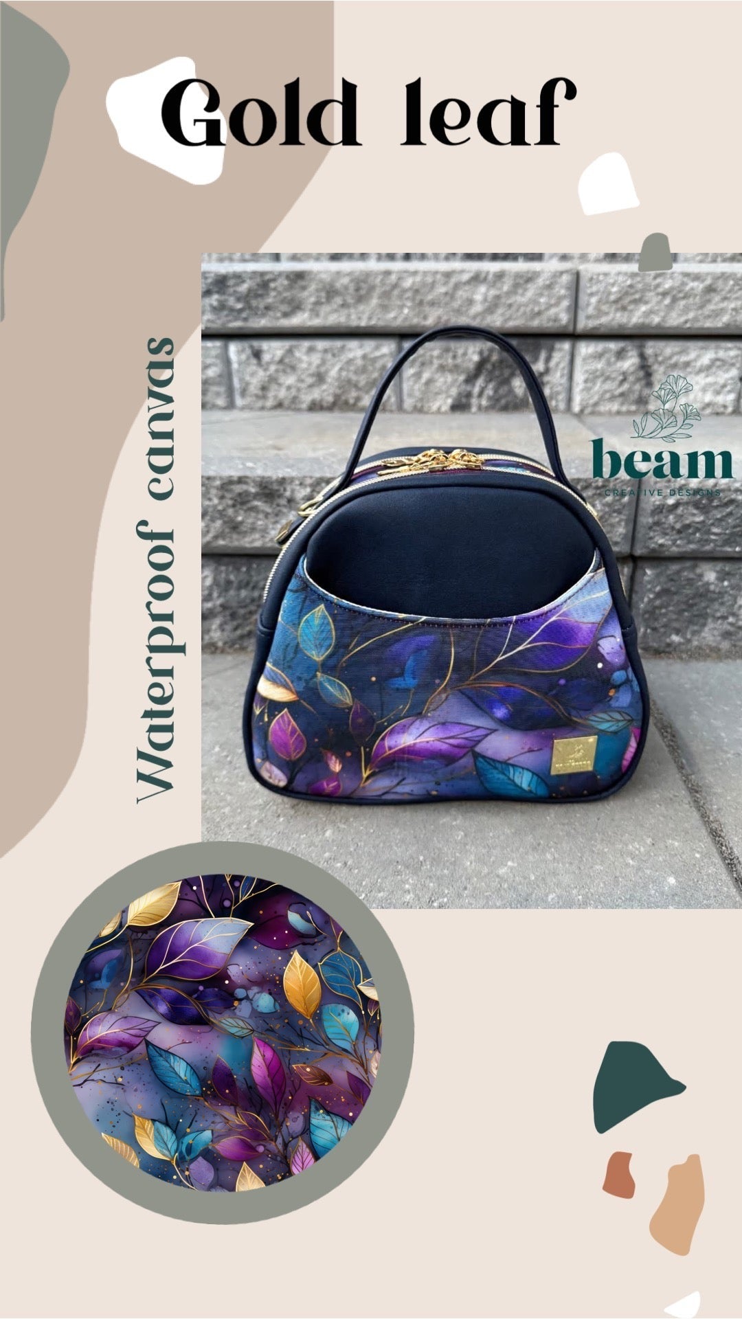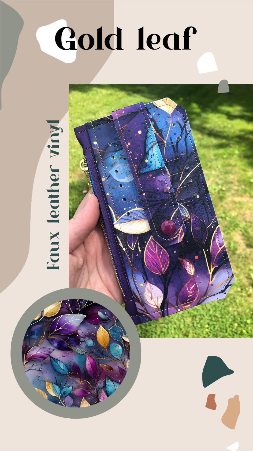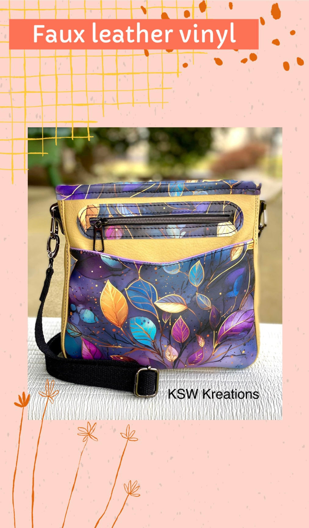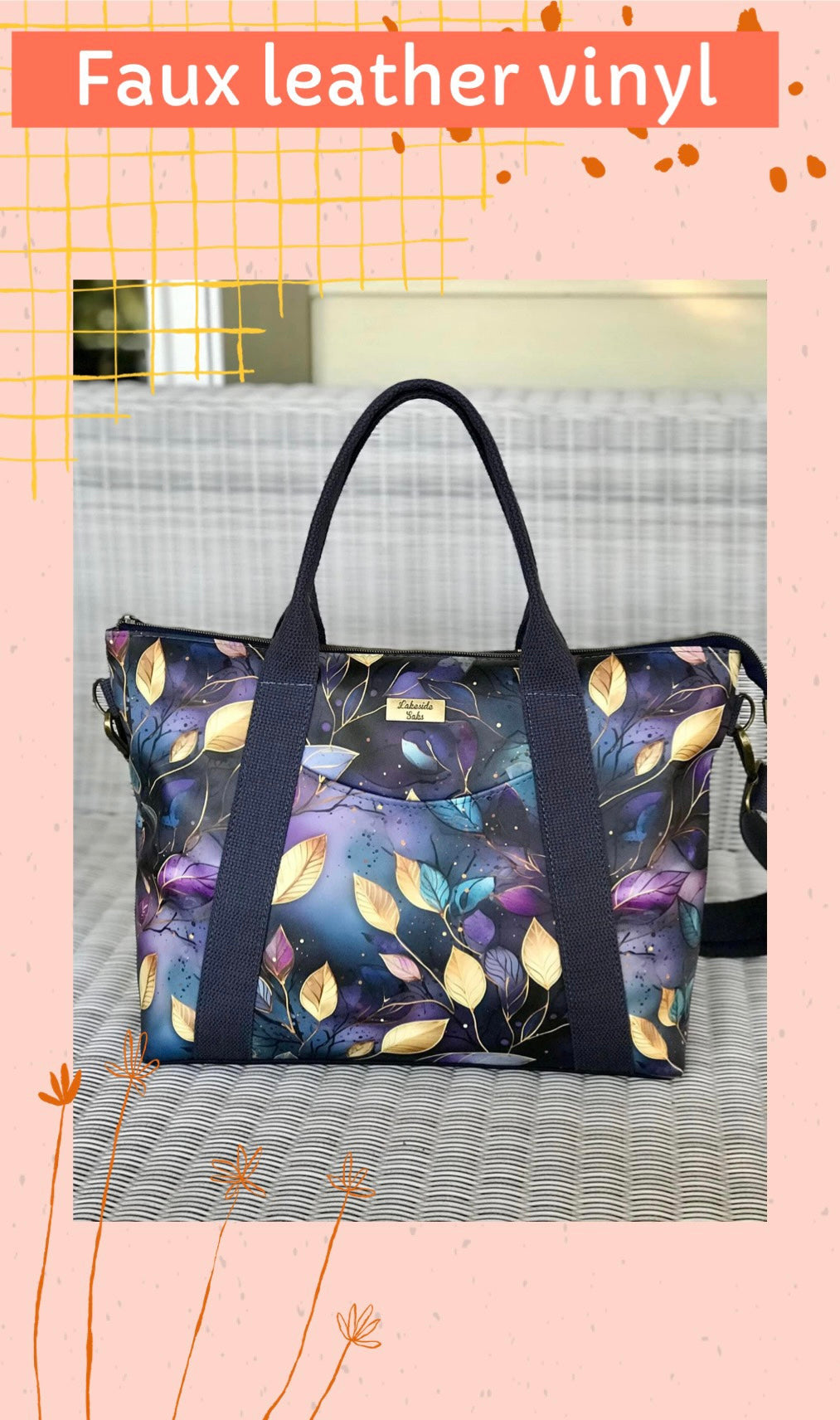 Custom printed faux leather vinyl with a smooth finish. Fabulous for purses and bags of all types and sizes. Waterproof and durable. Cuts beautifully with scissors or a rotary blade. This vinyl is very similar to cork for thickness and flexibility. A domestic machine can sew through it. While microtex needles are recommended, it was tested with universal ones with no issues. Do not pin vinyl as holes will be permanent. Instead use clips.
