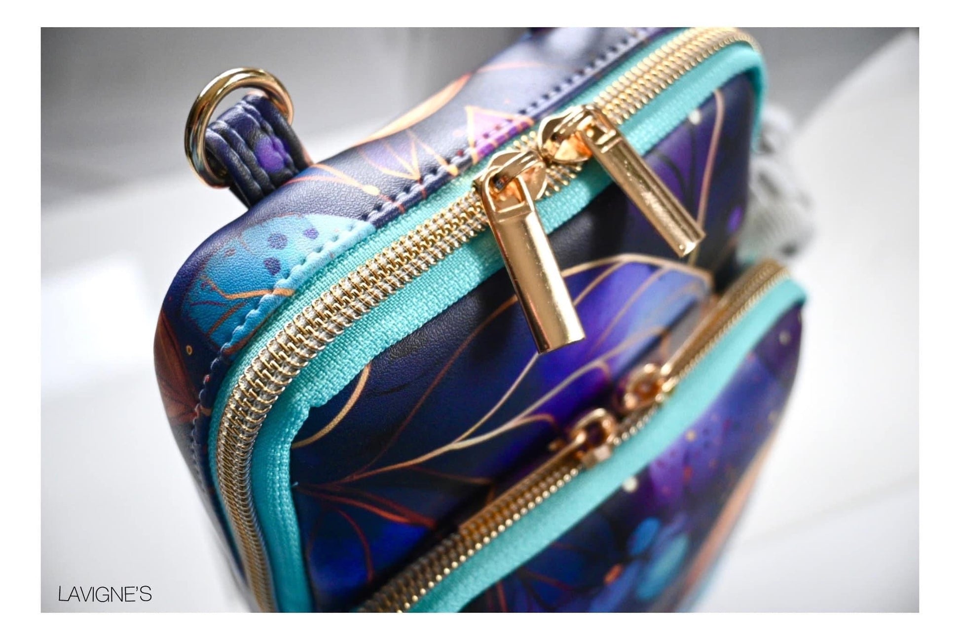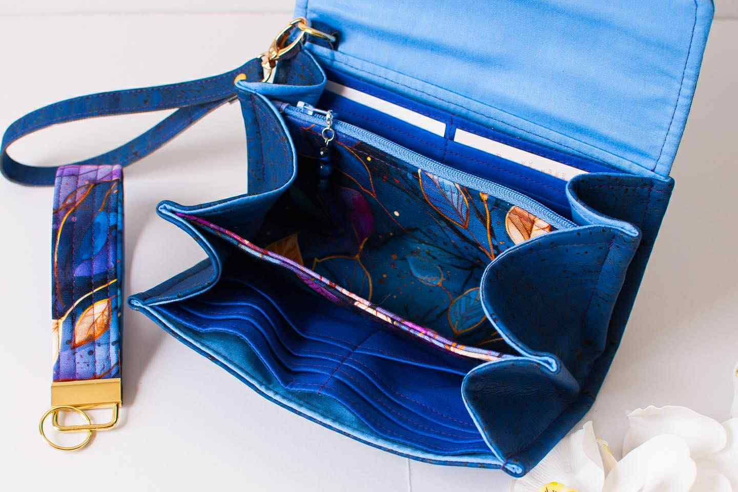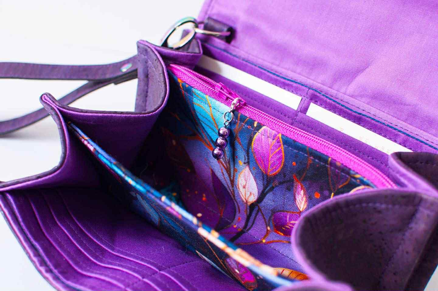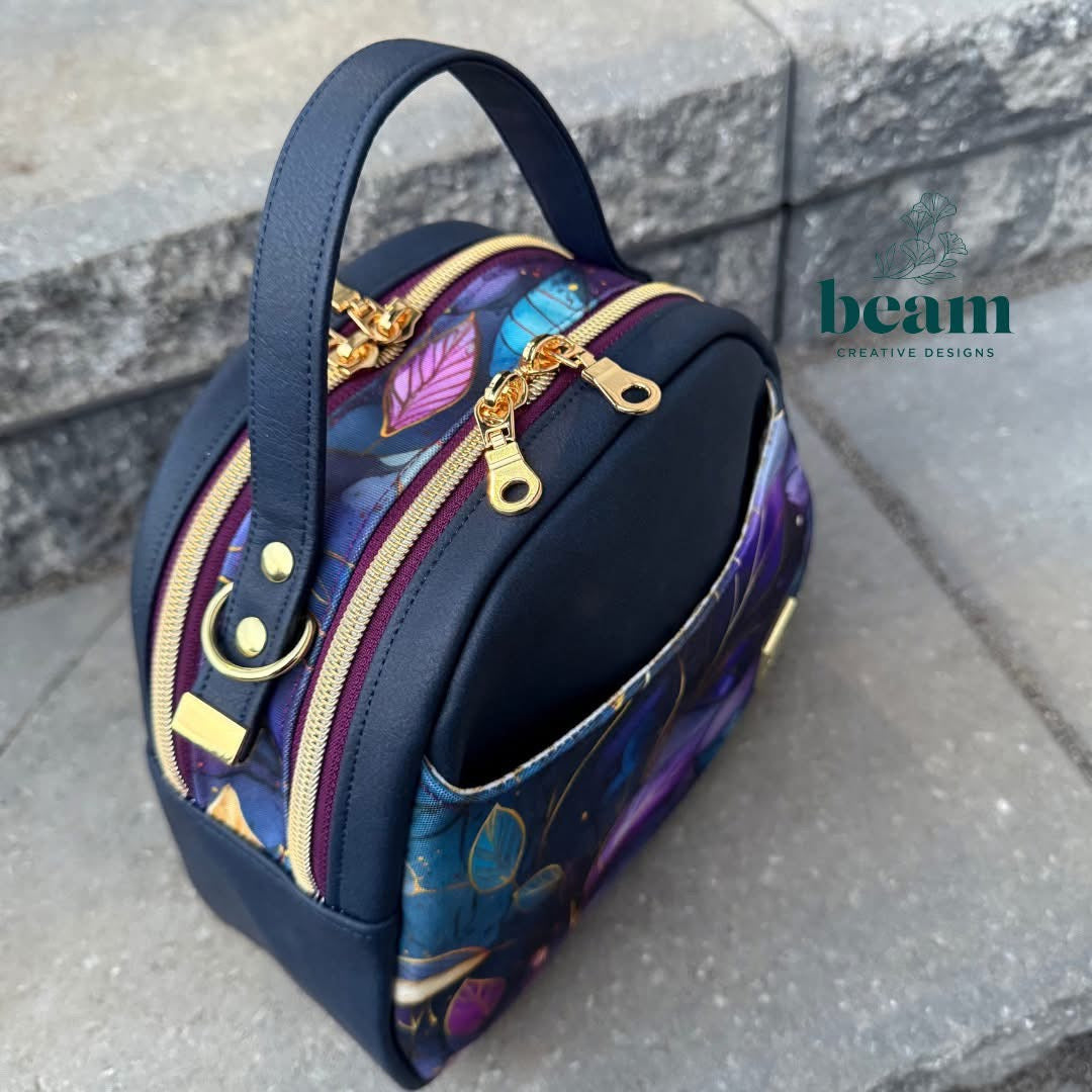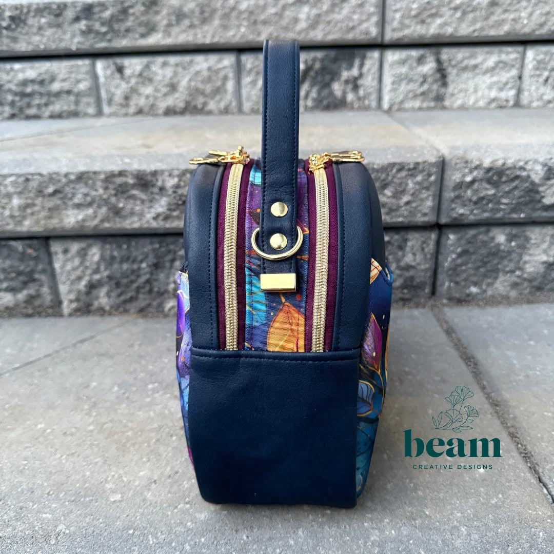 Custom printed faux leather vinyl with a smooth finish. Fabulous for purses and bags of all types and sizes. Waterproof and durable. Cuts beautifully with scissors or a rotary blade. This vinyl is very similar to cork for thickness and flexibility. A domestic machine can sew through it. While microtex needles are recommended, it was tested with universal ones with no issues. Do not pin vinyl as holes will be permanent. Instead use clips.