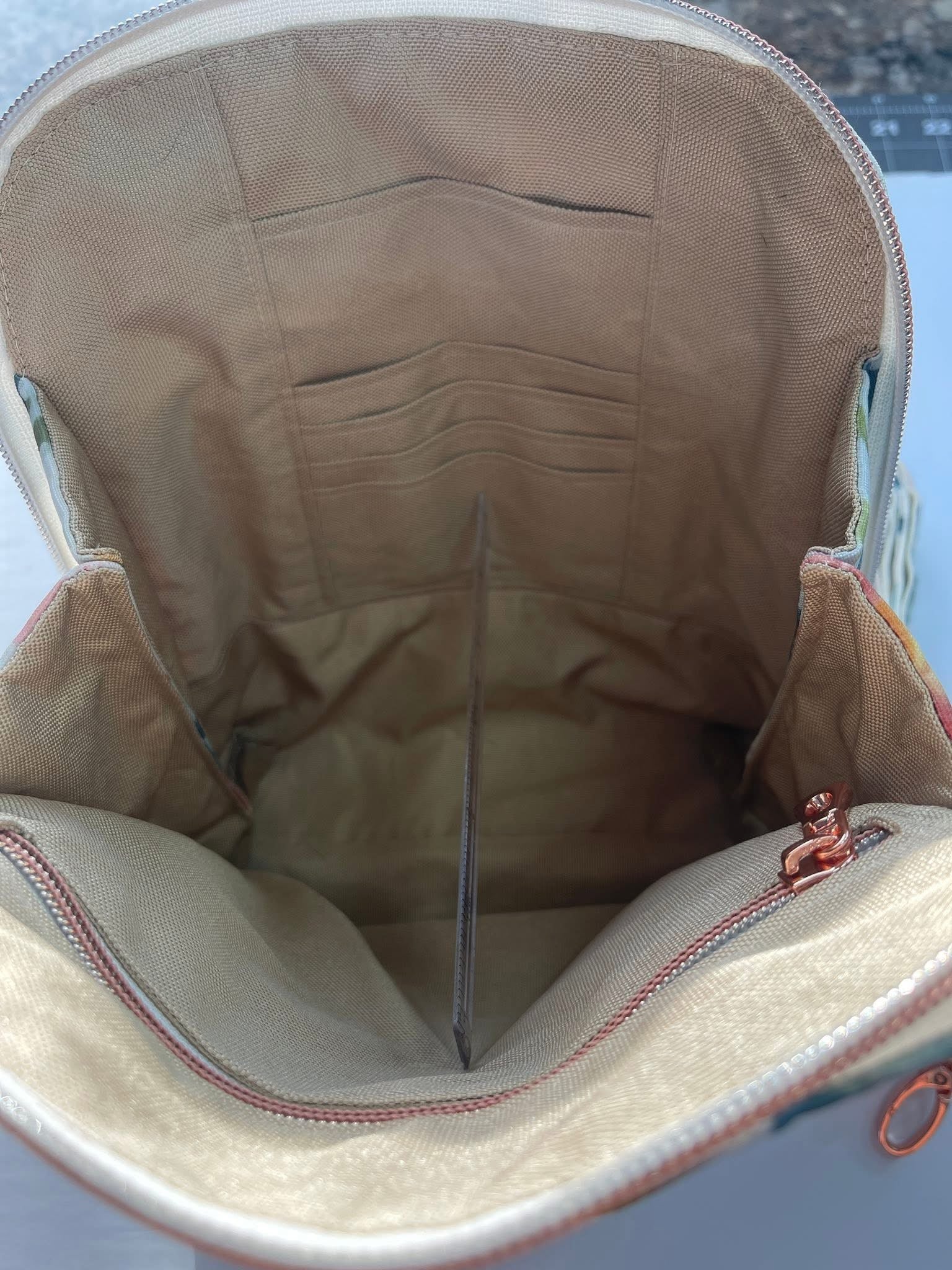 A brand new bag making base that is 100% waterproof, can be ironed and doesn’t fray. It’s lightweight and flexible. Not too thick but not too thin. Easily add interfacing, cuts with no problem and can be sewn with a universal needle and domestic machine. A bit slippery but clips hold it in place no problem. Zero stretch