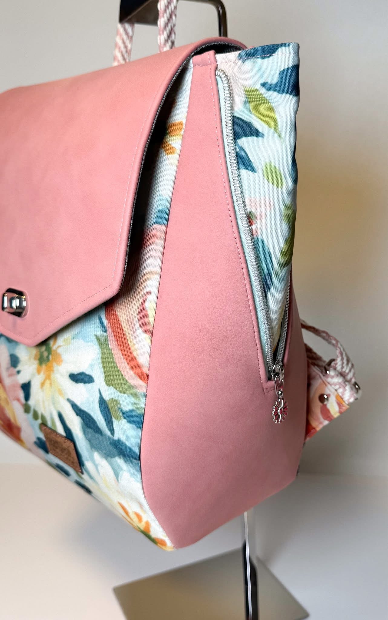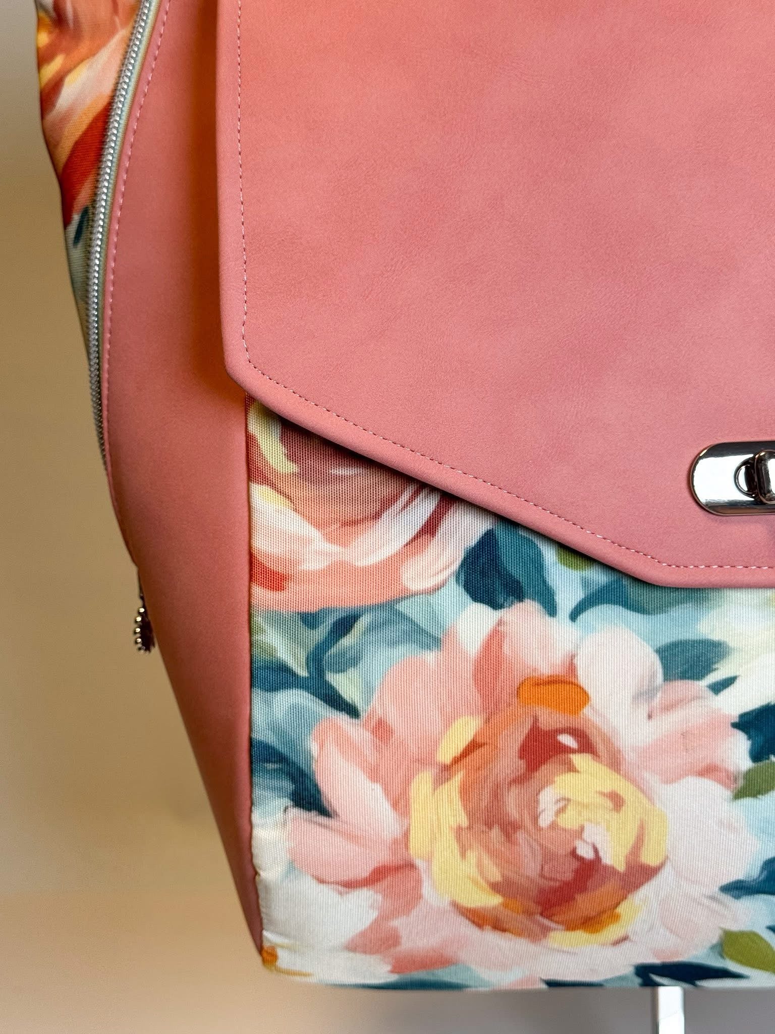 Custom printed faux leather vinyl with a smooth finish. Fabulous for purses and bags of all types and sizes. Waterproof and durable. Cuts beautifully with scissors or a rotary blade. This vinyl is very similar to cork for thickness and flexibility. A domestic machine can sew through it. While microtex needles are recommended, it was tested with universal ones with no issues. Do not pin vinyl as holes will be permanent. Instead use clips.