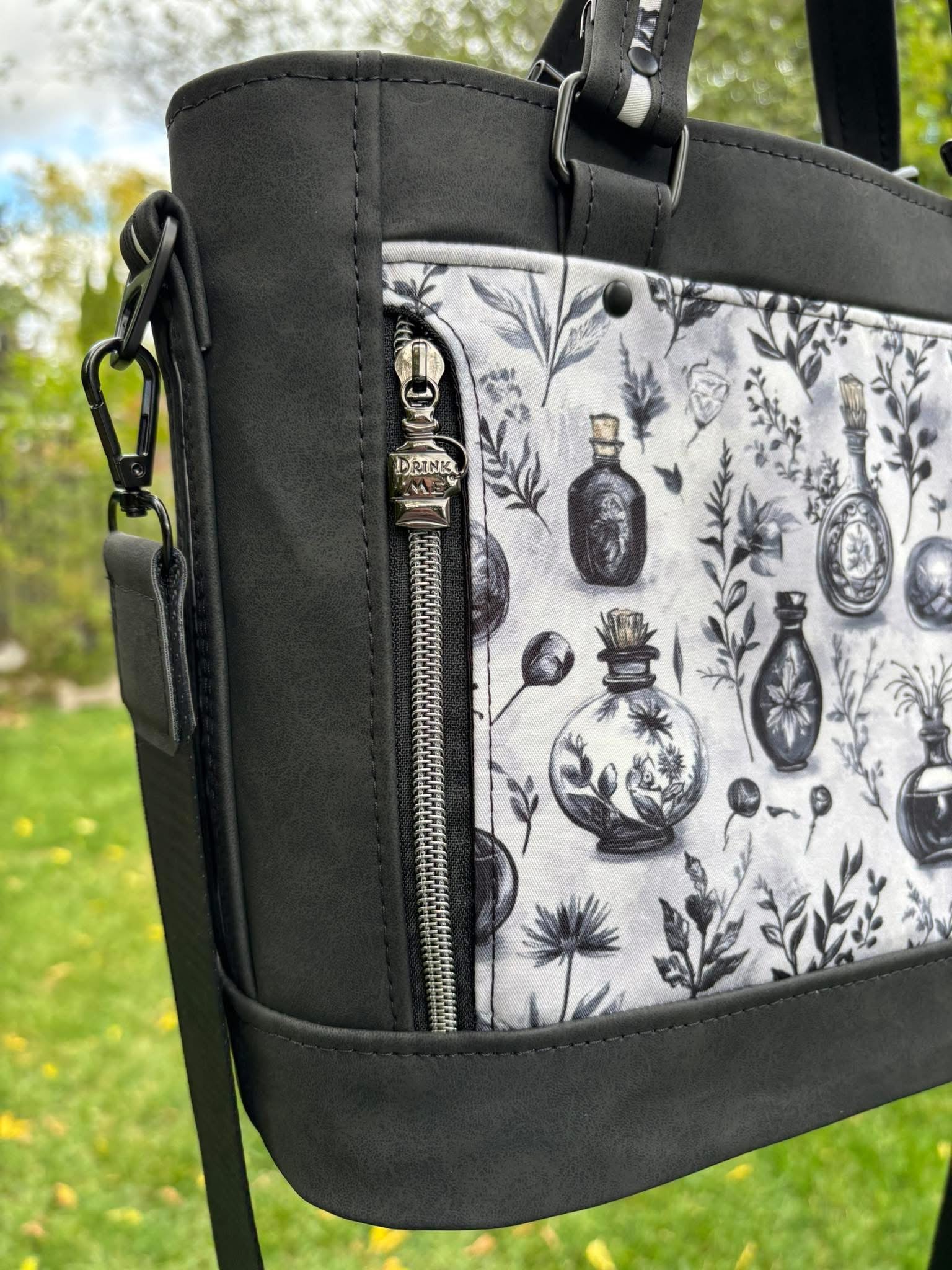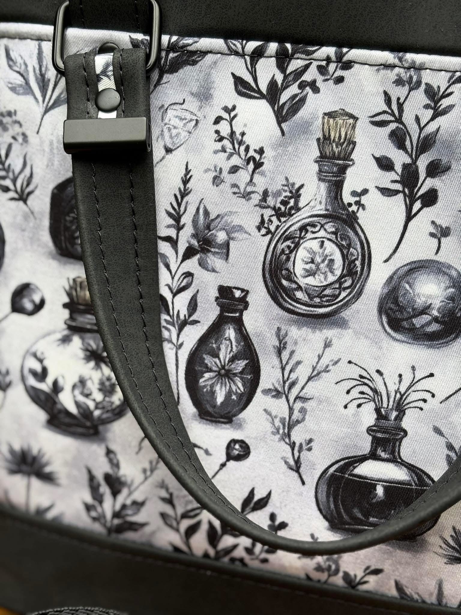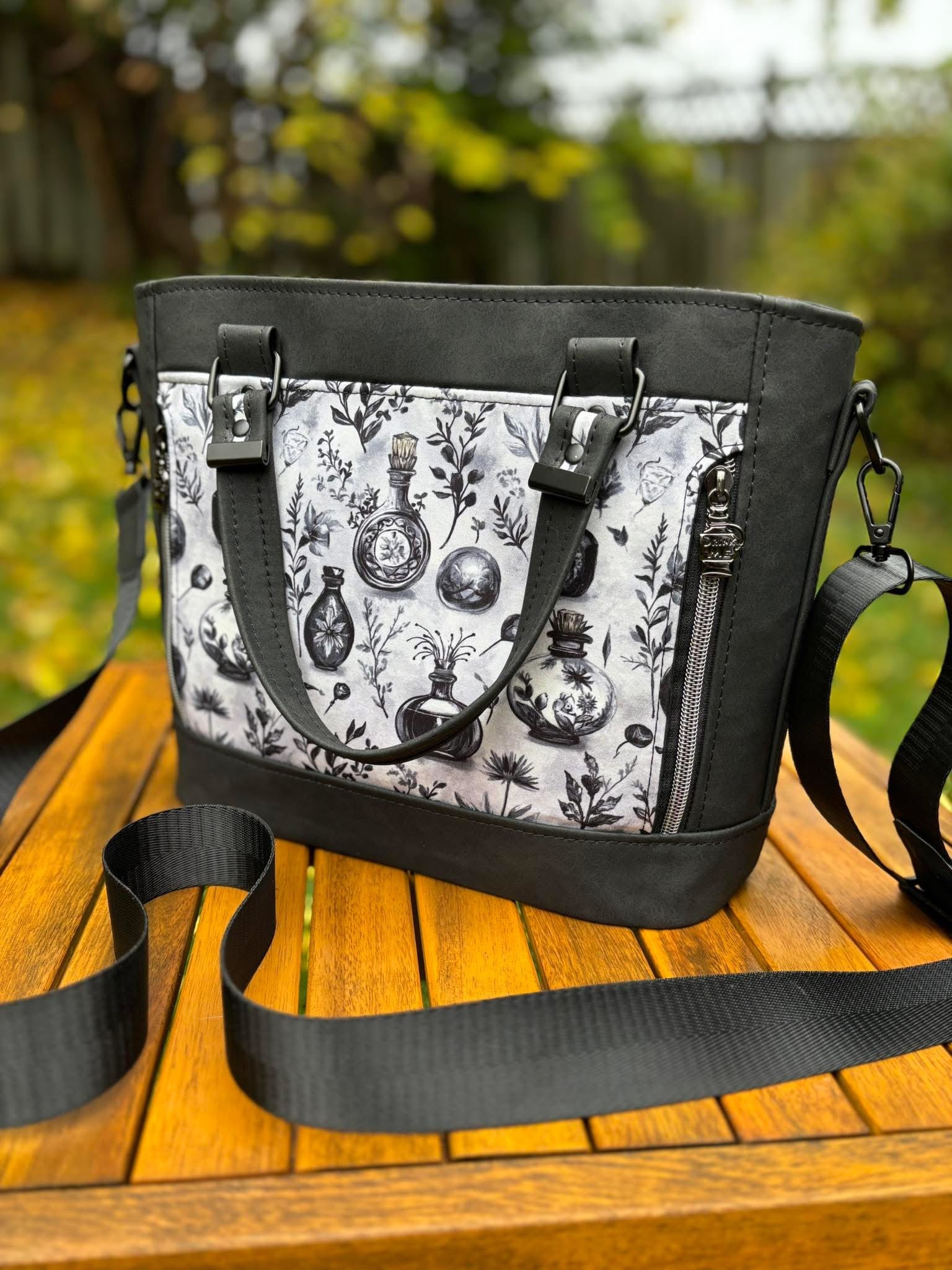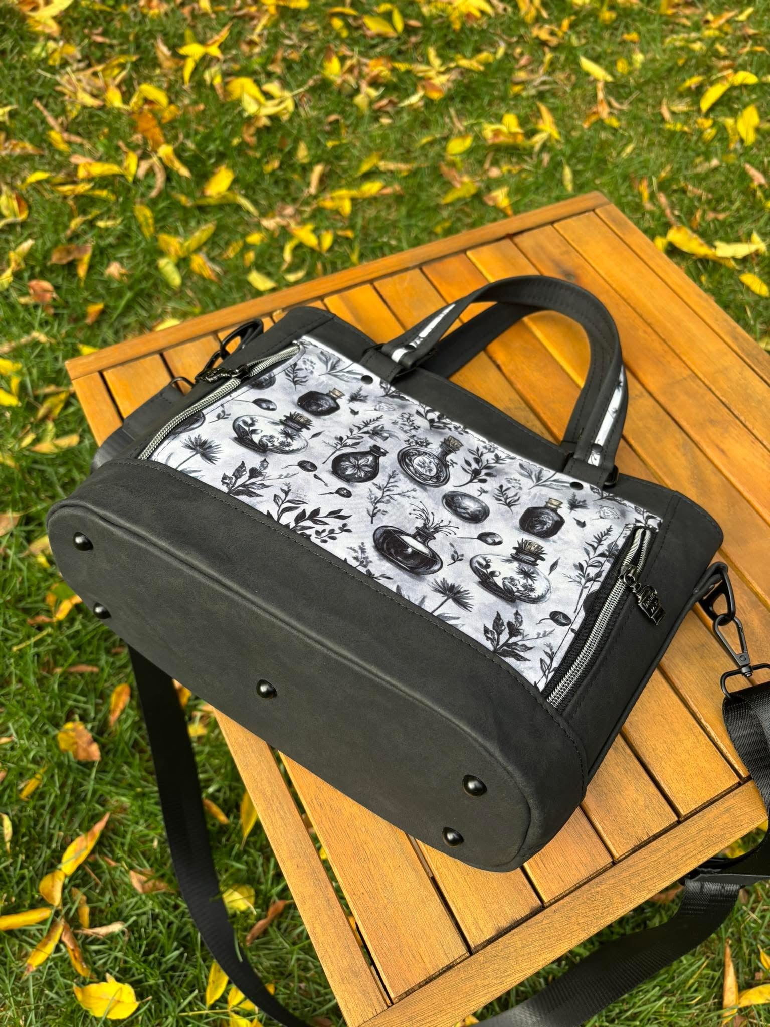 Custom printed faux leather vinyl with a smooth finish. Fabulous for purses and bags of all types and sizes. Waterproof and durable. Cuts beautifully with scissors or a rotary blade. This vinyl is very similar to cork for thickness and flexibility. A domestic machine can sew through it. While microtex needles are recommended, it was tested with universal ones with no issues. Do not pin vinyl as holes will be permanent. Instead use clips.