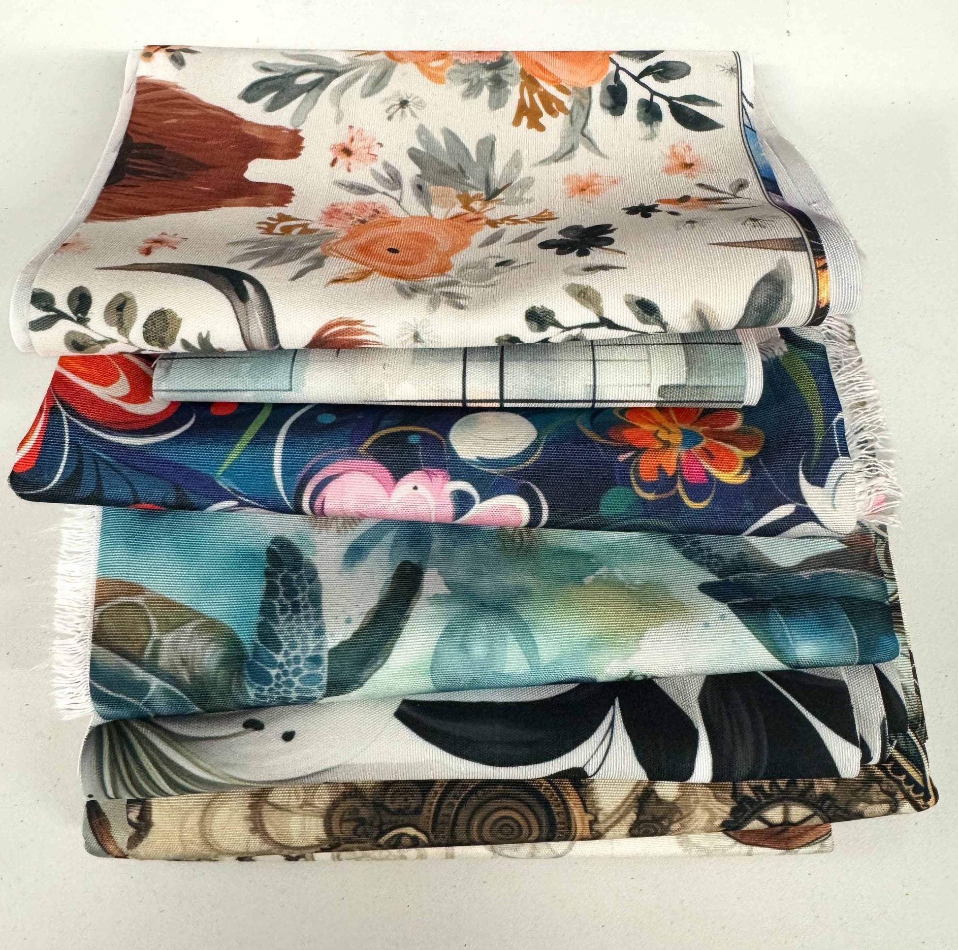Custom printed waterproof canvas will change your bag making game. Durable for the exterior or interior of bags, this canvas is flexible and not too thick but not too thin. This is considered to be a medium weight fabric. Can be ironed just be sure to use your synthetic setting