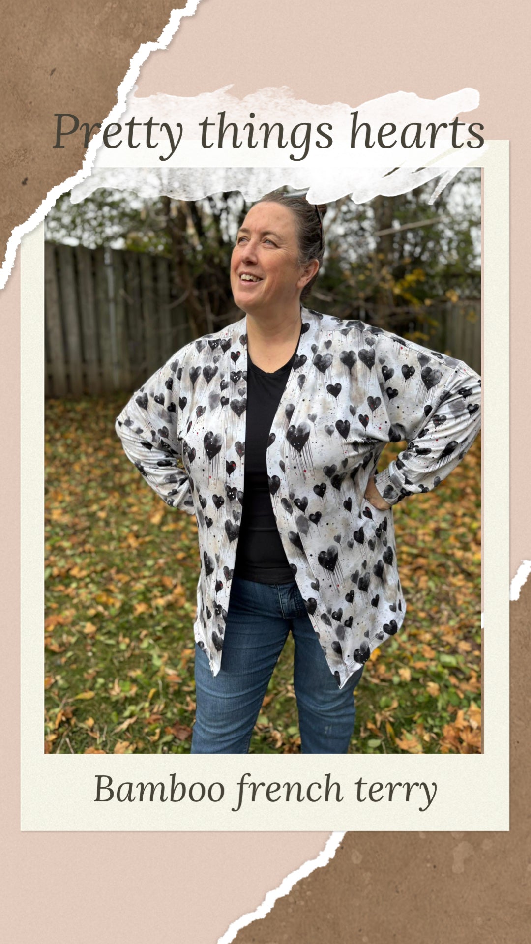 Custom printed bamboo french terry knit fabric. Perfect for a variety of clothing options it is very soft and easy to work with. 40% stretch, 4-way
