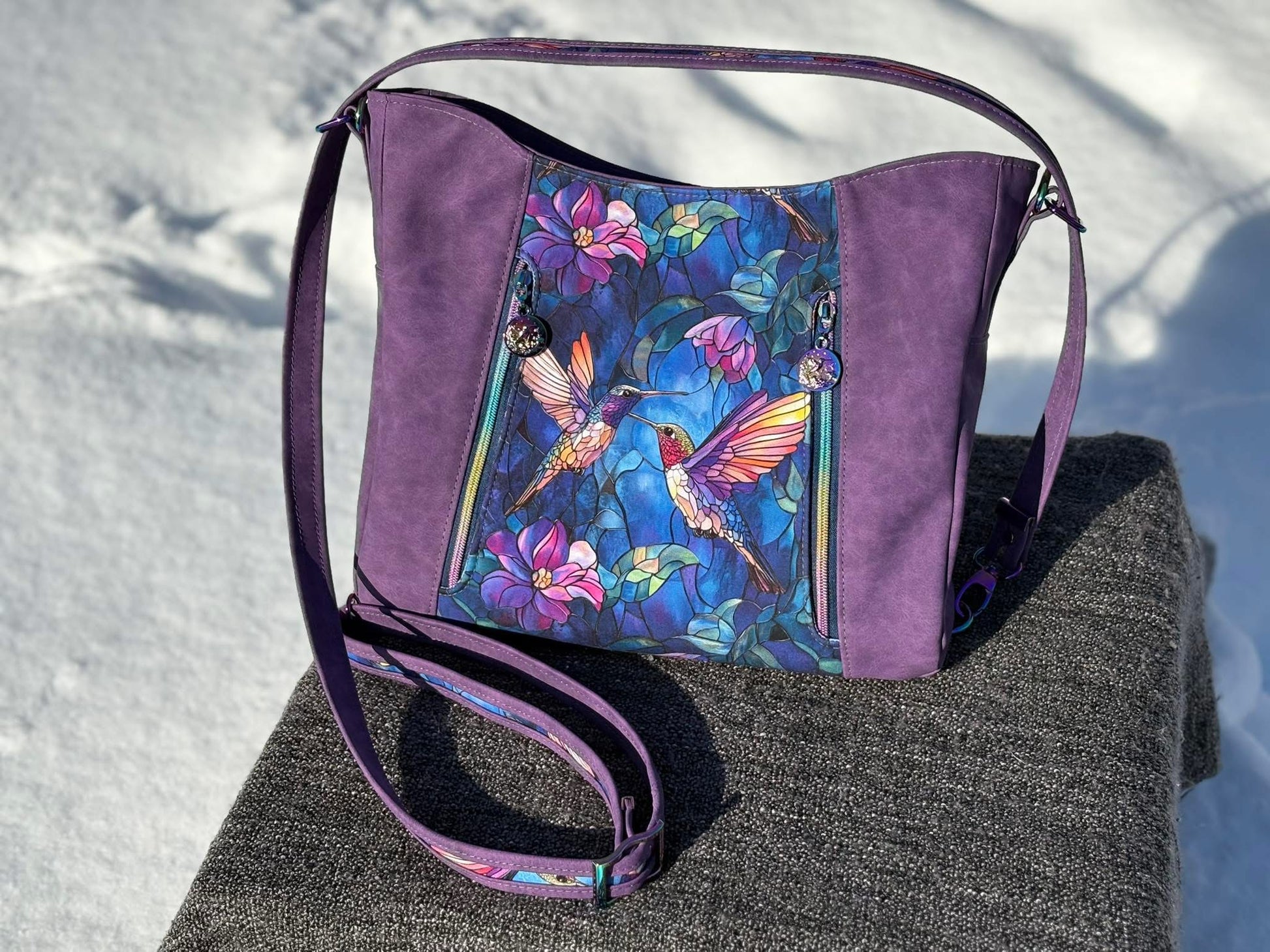 Custom printed faux leather vinyl with a smooth finish. Fabulous for purses and bags of all types and sizes. Waterproof and durable. Cuts beautifully with scissors or a rotary blade. This vinyl is very similar to cork for thickness and flexibility. A domestic machine can sew through it. While microtex needles are recommended, it was tested with universal ones with no issues. Do not pin vinyl as holes will be permanent. Instead use clips.