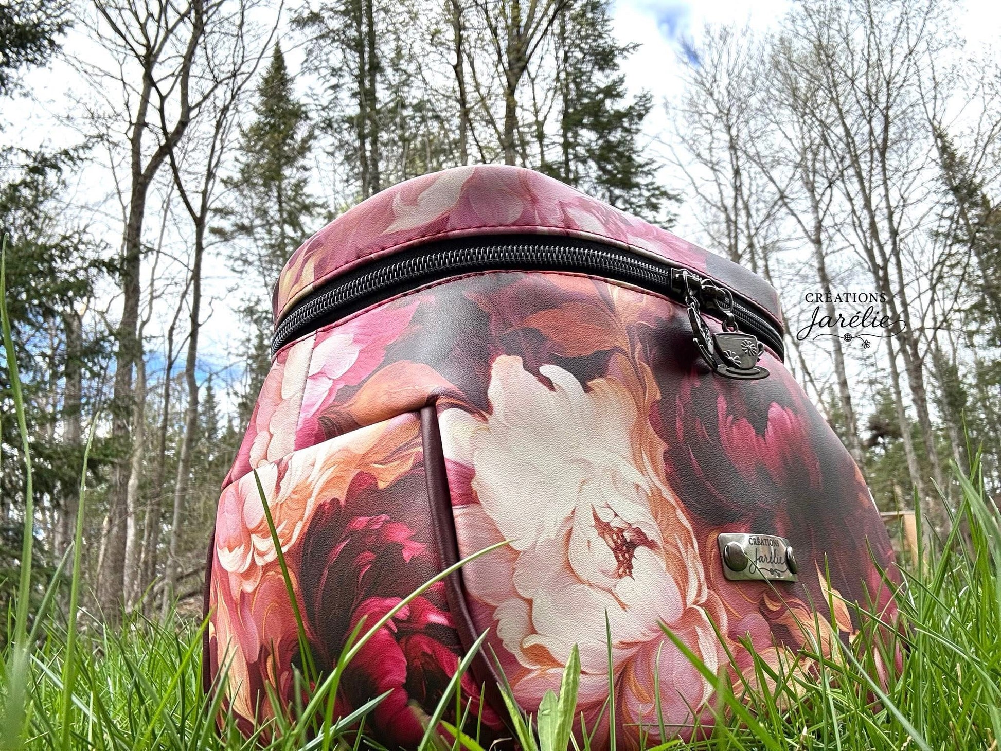 Custom printed faux leather vinyl with a smooth finish. Fabulous for purses and bags of all types and sizes. Waterproof and durable. Cuts beautifully with scissors or a rotary blade. This vinyl is very similar to cork for thickness and flexibility. A domestic machine can sew through it. While microtex needles are recommended, it was tested with universal ones with no issues. Do not pin vinyl as holes will be permanent. Instead use clips.
