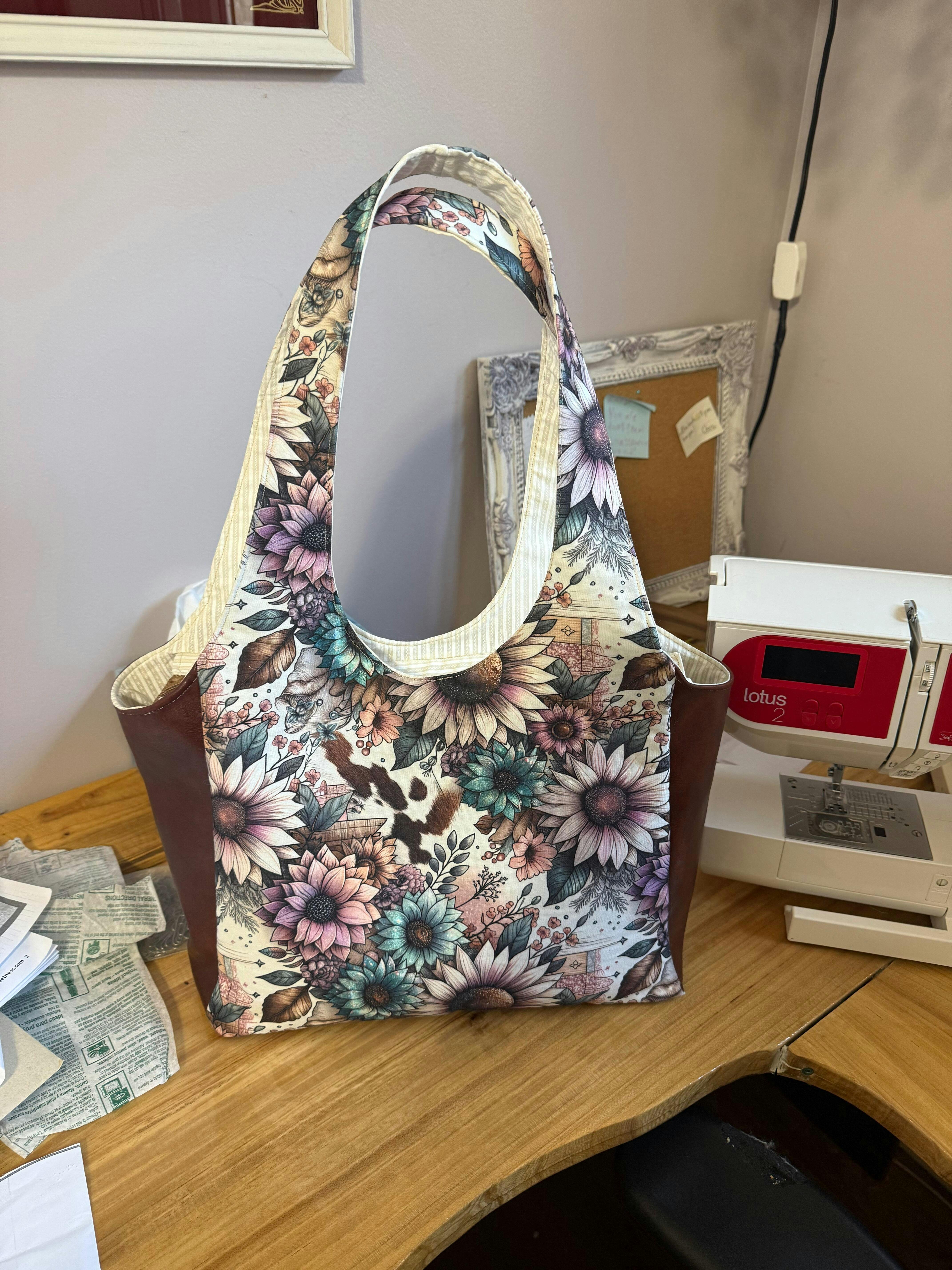 Custom printed faux leather vinyl with a smooth finish. Fabulous for purses and bags of all types and sizes. Waterproof and durable. Cuts beautifully with scissors or a rotary blade. This vinyl is very similar to cork for thickness and flexibility. A domestic machine can sew through it. While microtex needles are recommended, it was tested with universal ones with no issues. Do not pin vinyl as holes will be permanent. Instead use clips.